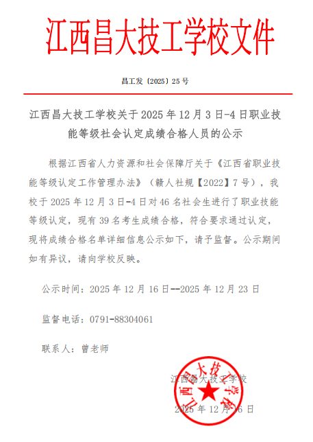 江西昌大技工学校关于2025年12月3日-4日职业技能等级社会认定成绩合格人员的公示